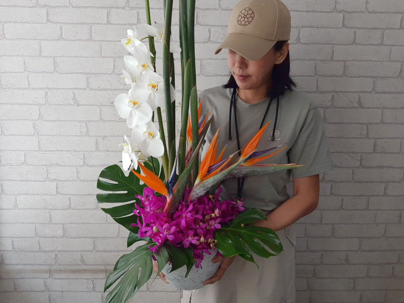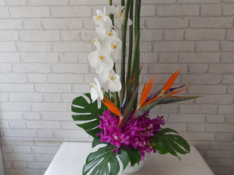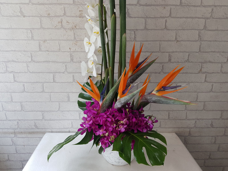 A captivating tropical arrangement featuring Bird of Paradise, Mokara orchids, and elegant white Phalaenopsis orchids in a sleek ceramic vase — a perfect blend of exotic beauty and timeless sophistication that instantly brightens any space.