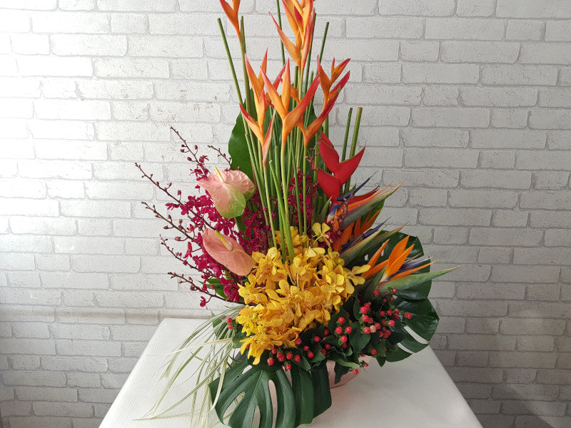 [As Shown] Mixture of Orchids, Bird of Paradise, Crab flower, Heliconia, Anthurium, Red Berries and Bear glass