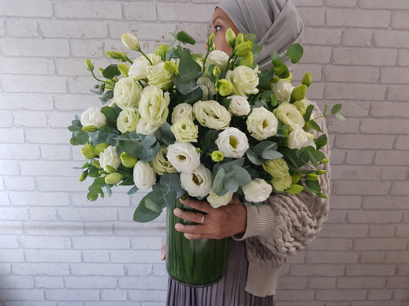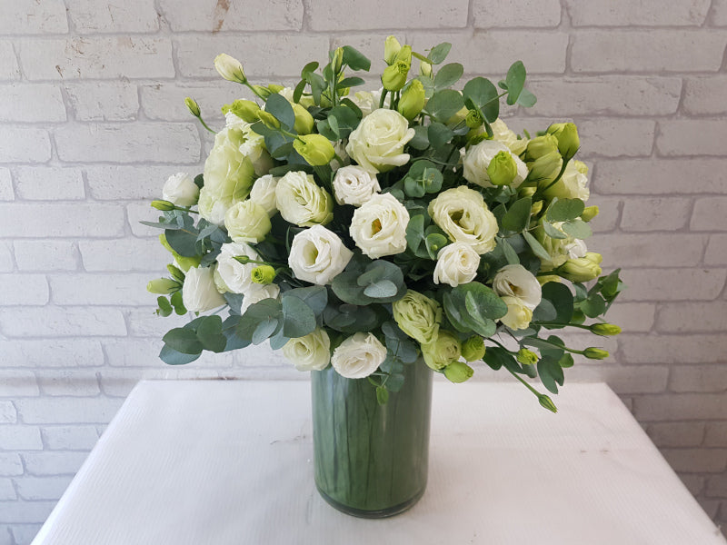 This crystal tall vase, this crisp arrangement of snow-white Eustomas and silvery-green Eucalyptus leaves offers modern sophistication perfect for a sleek home accent, corporate event, or an elegant congratulatory gift.
