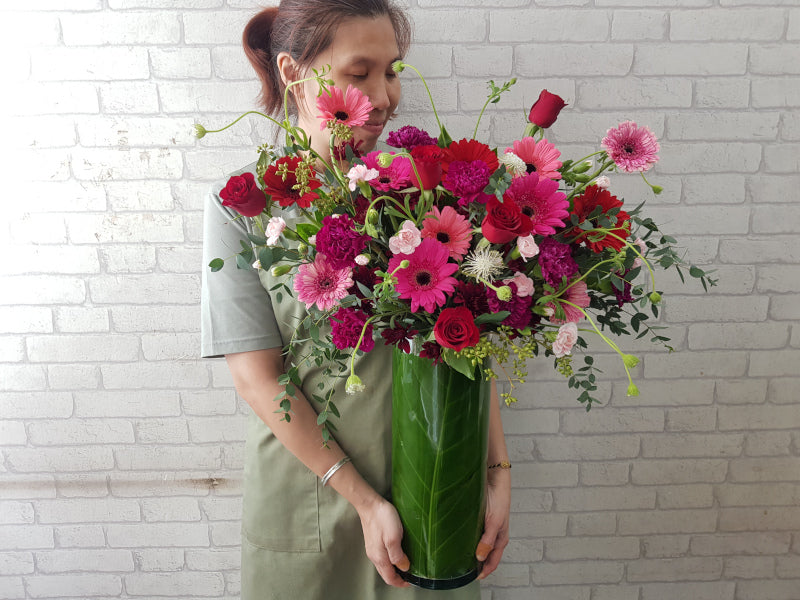 A vibrant tall vase of red and pink Gerberas, Carnations, and delicate Lace Flowers. This cheerful arrangement is the perfect way to share smiles with a beloved friend or someone special.