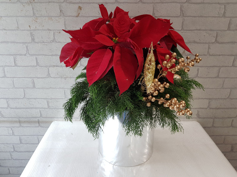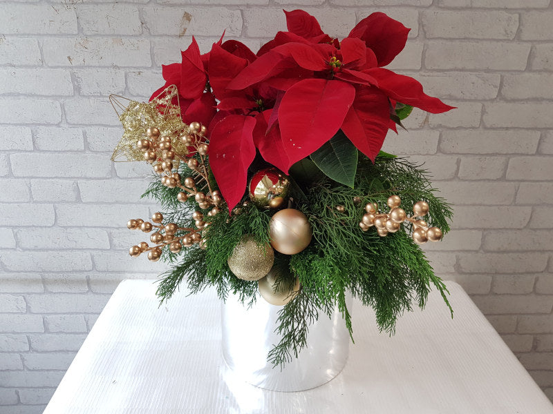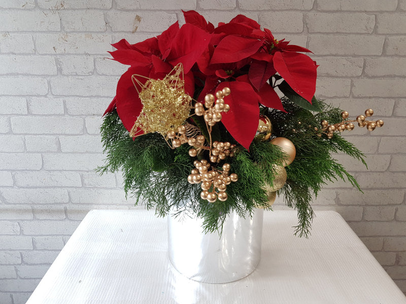 Bring holiday cheer into your home with this poinsettia flower, adorned with Christmas leaves and golden ornaments, elegantly presented in a shimmering gold box.