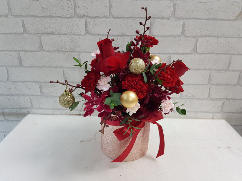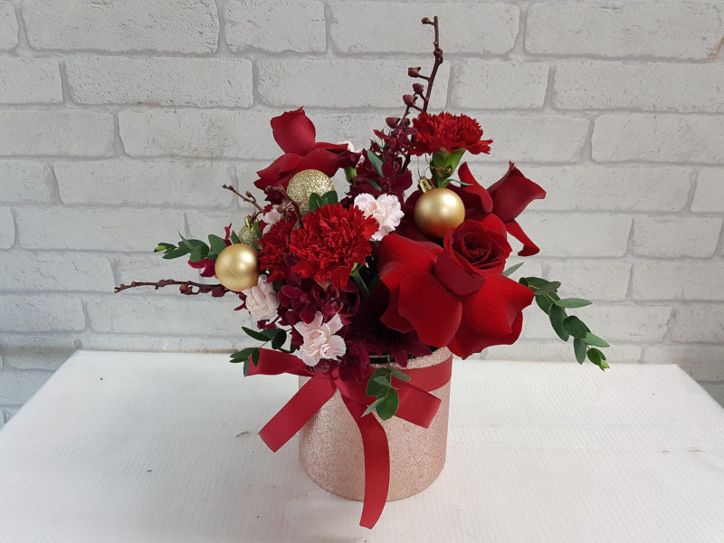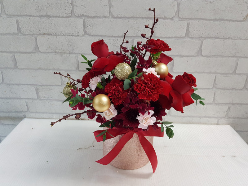 [As Shown] Mixture of 5 Roses, 5 Carnation, Carnation Spray, Anora Orchids, Pompom and Christmas Decoration